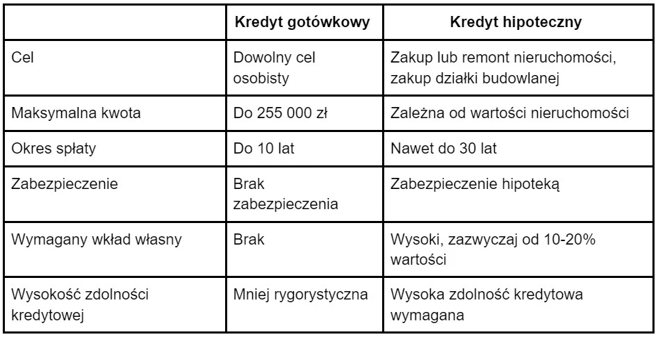 Kredyt hipoteczny jest dłuższym zobowiązaniem, wymagającym większej ilości formalności i zazwyczaj większej wysokości zdolności kredytowej oraz wkładu własnego, w porównaniu do bardziej elastycznego kredytu gotówkowego.