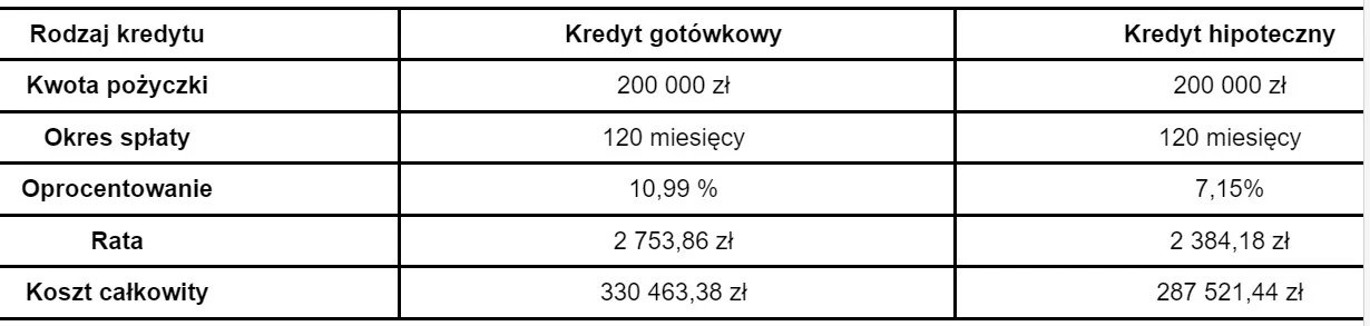 Kredyt hipoteczny jest najczęściej zaciągany na 25 lat, a do tego wymaga zabezpieczenia na nieruchomości. To sprawia, że jest tańszy niż kredyt gotówkowy, głównie ze względu na niższe oprocentowanie. Na ogół jednak kwota takiego zobowiązania jest dość wysoka, a do banku po tak długim okresie trzeba oddawać nawet 70-80% więcej aniżeli pożyczasz. Nie jest więc tak, że kredyt hipoteczny to tani wybór.