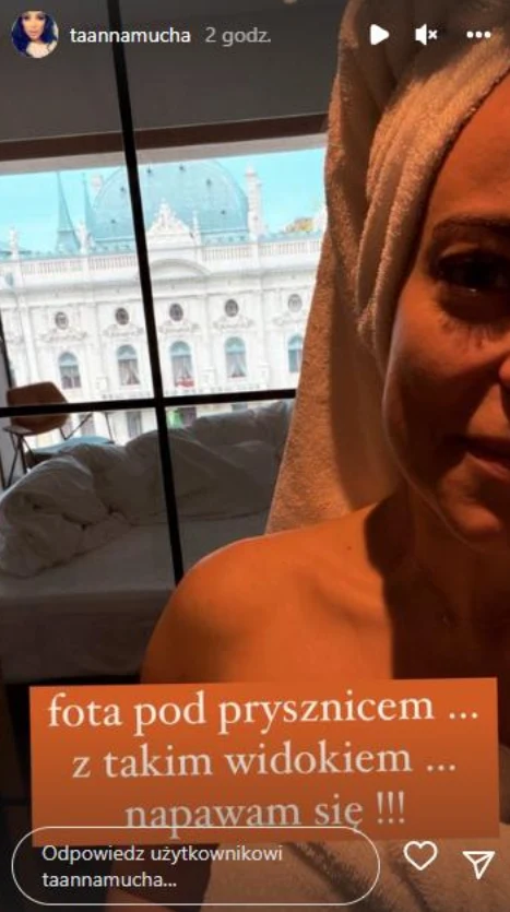 Fota pod prysznicem... Z takim widokiem... Napawam się - napisała Mucha.