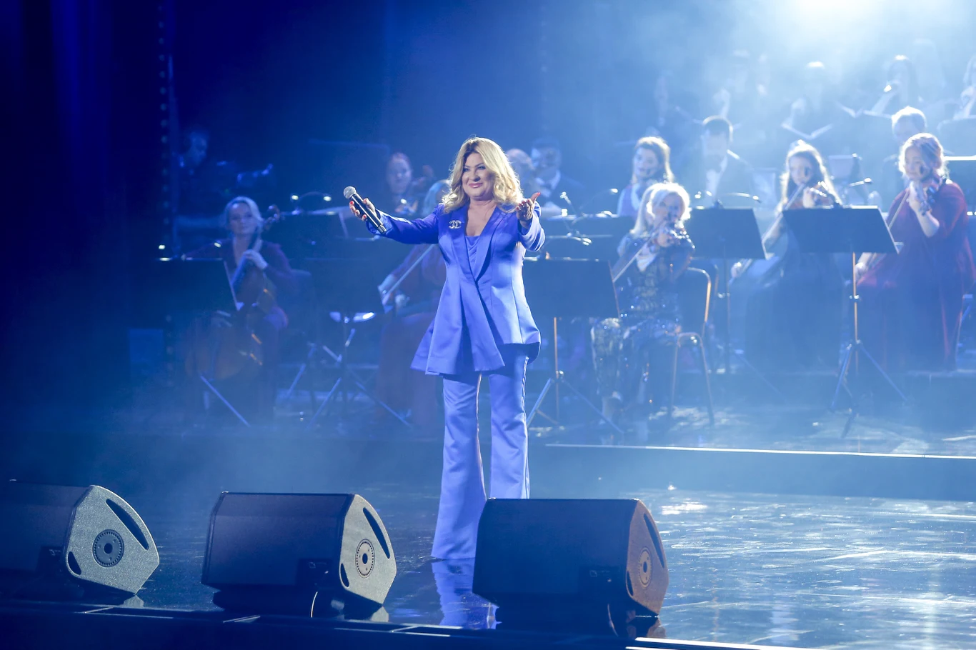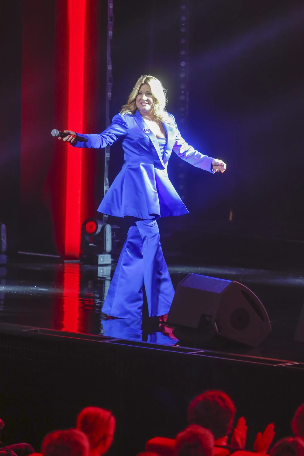 Beata Kozidrak w niebieskiej stylizacji tańczy na scenie