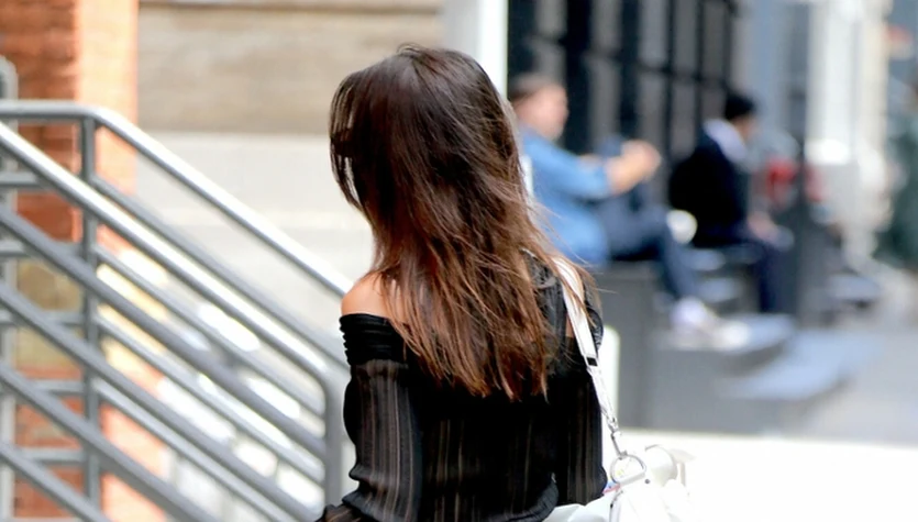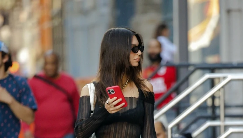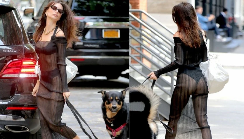 Emily miała na sobie siateczkową sukienkę, spod której widocznie prześwitywała czarna bielizna. Do tego sportowe tenisówki oraz biała torba XXL. Kiedy odwróciła się tyłem, można było zobaczyć jej zgrabne pośladki w całej okazałości.