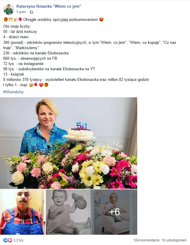 Okrągłe urodziny sprzyjają podsumowaniom Oto moje liczby: 50 - lat dziś kończę 4 - dzieci mam 300 (ponad) - odcinków programów telewizyjnych, w tym "Wiem, co jem", "Wiem, co kupuję", "Co nas truje", "MądrzeJemy" 230 - odcinków na kanale Ekobosacka 660 tys. - obserwujących na FB 72 tys. - na instagramie 98 tys. - subskrybentów na kanale Ekobosacka na YT 13 - książek 8 milionów 378 tysięcy - wyświetleń kanału Ekobosacka oraz milion 82 tysiące godzin I tylko 1 - mąż