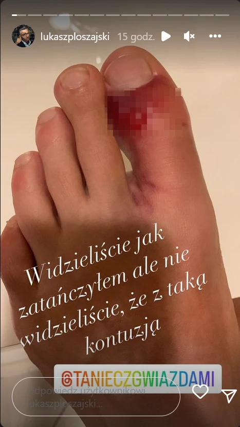 Łukasz, aby wzbudzić jeszcze większe współczucie wśród fanów, postanowił pokazać internautom, że podczas występu w "TzG" był kontuzjowany. Na jego instagramowym koncie pojawiła się fotografia, na której wyraźnie widać posiniaczony i zakrwawiony palec u stopy.