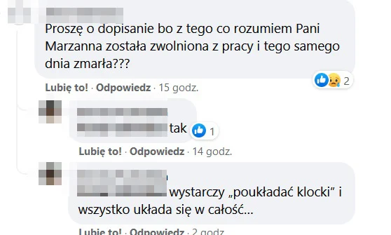 Jak można komuś w tych czasach płacić najniższą krajową... Jeszcze bezczelnie mówiąc, że tak się wszędzie płaci... Przecież to chore. Niech pan menadżer sobie pożyje za najniższą krajową, to mu ten fałszywy uśmieszek z gęby zniknie szybko. 40-letnia pracownica... Współczuję temu klubowi, że ma taką kadrę zarządzającą. Niech pani ziemia lekką będzie pani Marzenno. ŚP.