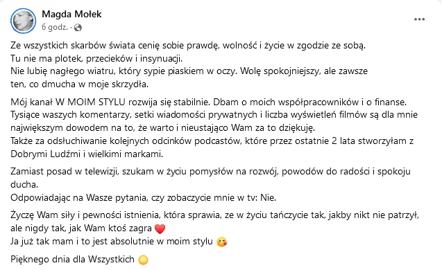 Ze wszystkich skarbów świata cenię sobie prawdę, wolność i życie w zgodzie ze sobą. Tu nie ma plotek, przecieków i insynuacji. Nie lubię nagłego wiatru, który sypie piaskiem w oczy. Wolę spokojniejszy, ale zawsze ten, co dmucha w moje skrzydła. Mój kanał W MOIM STYLU rozwija się stabilnie. Dbam o moich współpracowników i o finanse. Tysiące waszych komentarzy, setki wiadomości prywatnych i liczba wyświetleń filmów są dla mnie największym dowodem na to, że warto i nieustająco Wam za to dziękuję. Także za odsłuchiwanie kolejnych odcinków podcastów, które przez ostatnie 2 lata stworzyłam z Dobrymi Ludźmi i wielkimi markami. Zamiast posad w telewizji, szukam w życiu pomysłów na rozwój, powodów do radości i spokoju ducha. Odpowiadając na Wasze pytania, czy zobaczycie mnie w tv: Nie. Życzę Wam siły i pewności istnienia, która sprawia, że w życiu tańczycie tak, jakby nikt nie patrzył, ale nigdy tak, jak Wam ktoś zagra. Ja już tak mam i to jest absolutnie w moim stylu. Pięknego dnia dla Wszystkich