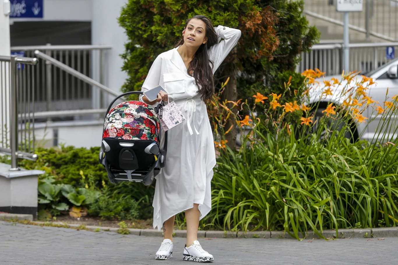 Po świeżo upieczoną mamę przyjechał jej ukochany, który pomógł jej zabrać torby z rzeczami.