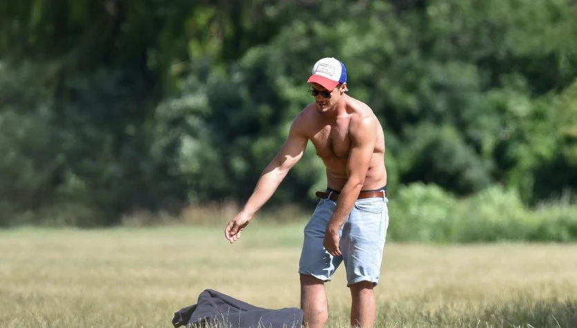 Upał jednak doskwierał i w pewnym momencie Mikołaj Roznerski zdjął koszulkę. Dzięki temu pokazał swoje muskularne ciało. Pogoda jednak nie dawała za wygraną i po krótkiej grze aktor wraz z synem udał się do samochodu.
