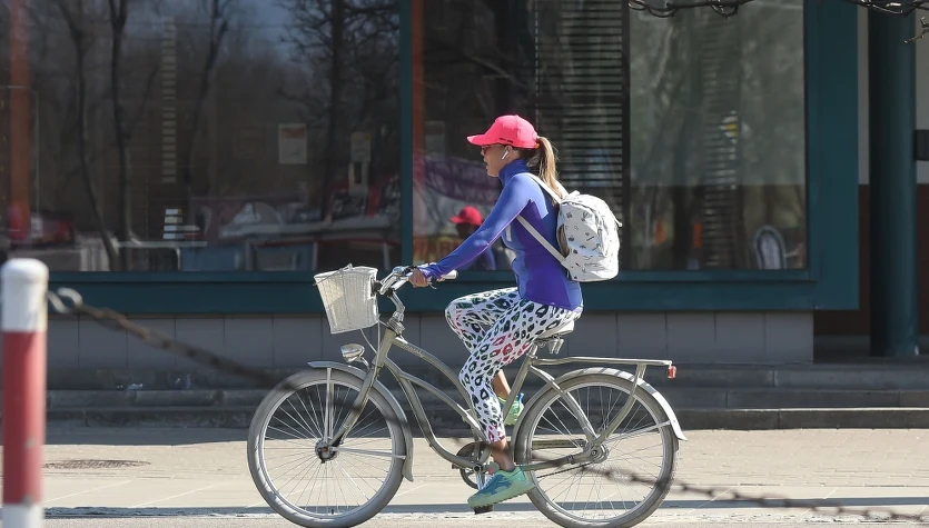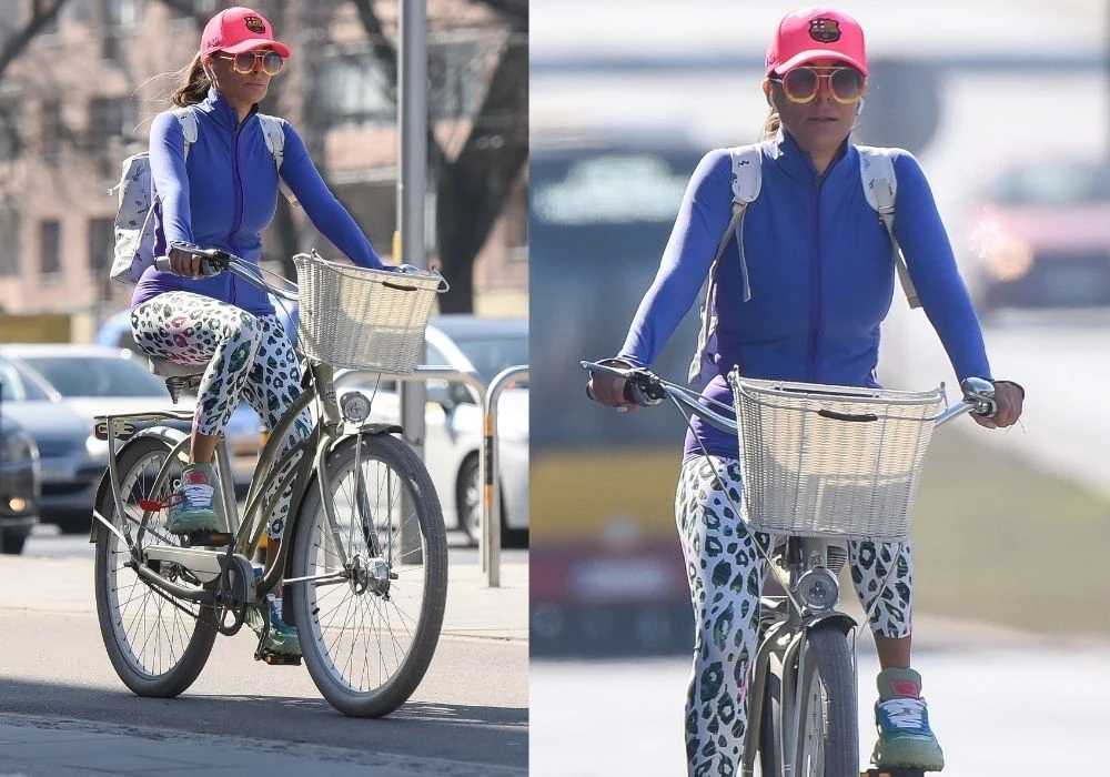 Małgorzata Rozenek-Majdan wybrała się na rower w bardzo młodzieżowej stylizacji: legginsy w cętki, różowa czapka z daszkiem FC Barcelony, niebieska bluza na suwak, biały plecaczek we wzorki i duże, pomarańczowe okulary.