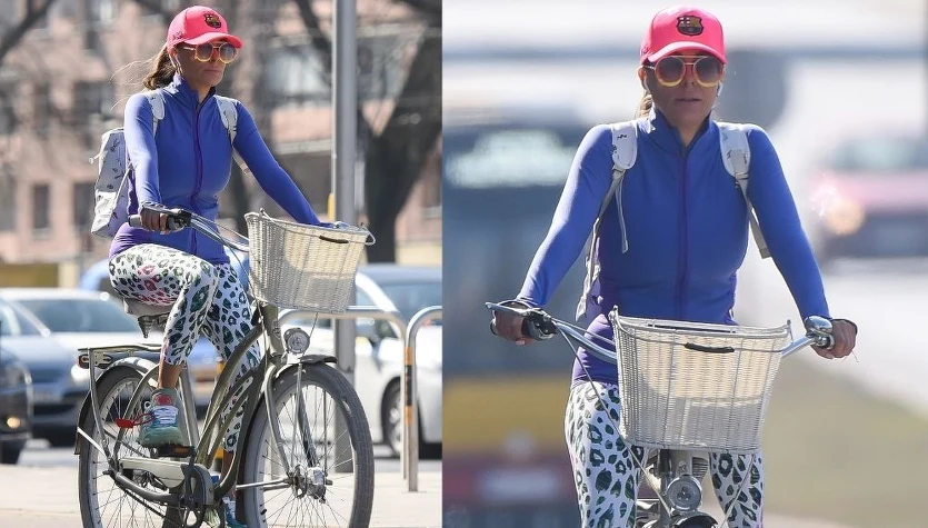 Małgorzata Rozenek jedzie rowerem na solarium