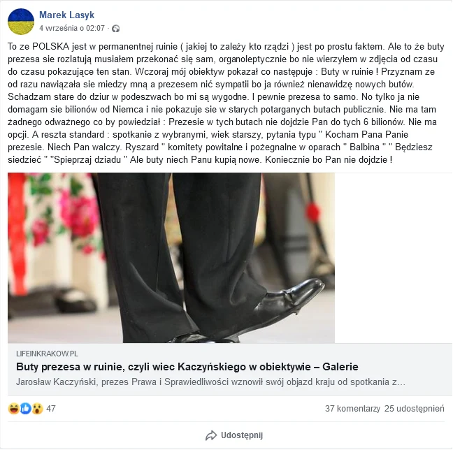 "To, że Polska jest w permanentnej ruinie (jakiej to zależy, kto rządzi) jest po prostu faktem. Ale to, że buty prezesa się rozlatują, musiałem przekonać się sam, organoleptycznie, bo nie wierzyłem w zdjęcia od czasu do czasu pokazujące ten stan. Wczoraj mój obiektyw pokazał, co następuje: Buty w ruinie!" - napisał Lasyk.