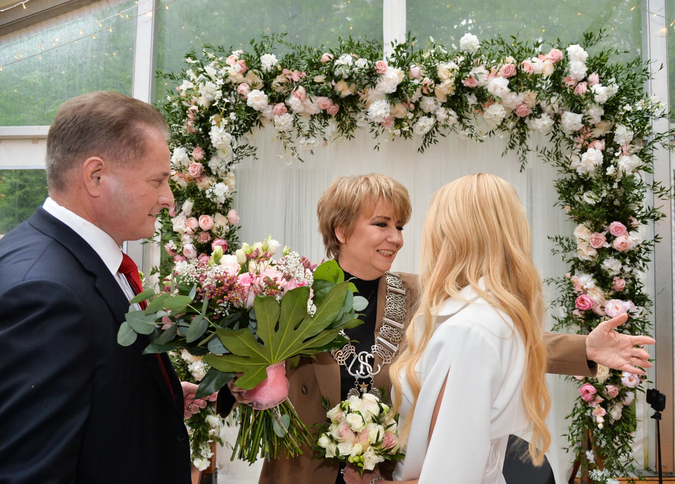 "Życzę wam miłości, która was połączyła, szczęścia, które już odnaleźliście, słońca w waszych sercach i pięknej pogody w waszych duszach. Musicie mi obiecać, że tak szczęśliwi jak dzisiaj będziecie do końca świata i jeden dzień dłużej" - życzyła nowożeńcom Hanna Zdanowska. Następnie zaczęło się kameralne wesele dla najbliższych osób. Na imprezie bawiło się około 70 gości.