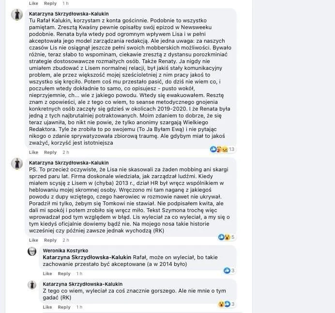 Tu Rafał Kalukin, korzystam z konta gościnnie. Podobnie to wszystko pamiętam. Zresztą Kwaśny pewnie opisałby swój epizod w Newsweeku podobnie. Renata była wtedy pod ogromnym wpływem Lisa i w pełni akceptowała jego model zarządzania redakcją. Ale jedna uwaga: za naszych czasów Lis nie osiągnął jeszcze pełni swoich mobberskich możliwości. Bywało różnie, teraz słabo to wspominam, ciekawie zresztą z dystansu porozkminiać strategie dostosowawcze rozmaitych osób. Także Renaty. Ja nigdy nie umiałem zbudować z Lisem normalnej relacji, był jakiś stały komunikacyjny problem, ale przez większość mojej sześcioletniej z nim pracy jakoś to wszystko się kręciło. Potem coś mu przestało pasić, do dziś nie wiem co, i poczułem wtedy dokładnie to samo, co opisujesz - pusto wokół, nieprzyjemnie, ch... wie z jakiego powodu. Wtedy się ewakuowałem. Resztę znam z opowieści, ale z tego co wiem, to seanse metodycznego gnojenia konkretnych osób zaczęły się gdzieś w okolicach 2019-2020. I że Renata była jedną z tych najbrutalniej potraktowanych. Moim zdaniem to dobrze, że się teraz ujawniła, bo nikt nie powie, że tylko anonimy szargają Wielkiego Redaktora. Tyle że zrobiła to po swojemu (To Ja Byłam Ewą) i nie pytając nikogo o zdanie, sprywatyzowała zbiorową traumę. Ale gdybym miał to jakoś zważyć, korzyść jest istotniejsza