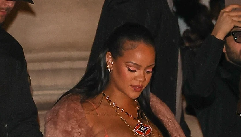 Rihanna miała na sobie brzoskwiniową, skórzaną i krótką sukienkę, którą przykryła płaszczem z owczej skóry do samej ziemi. Do tego złota biżuteria oraz mini torebka Diora. Całość dopełniły srebrne sandałki na obcasie.