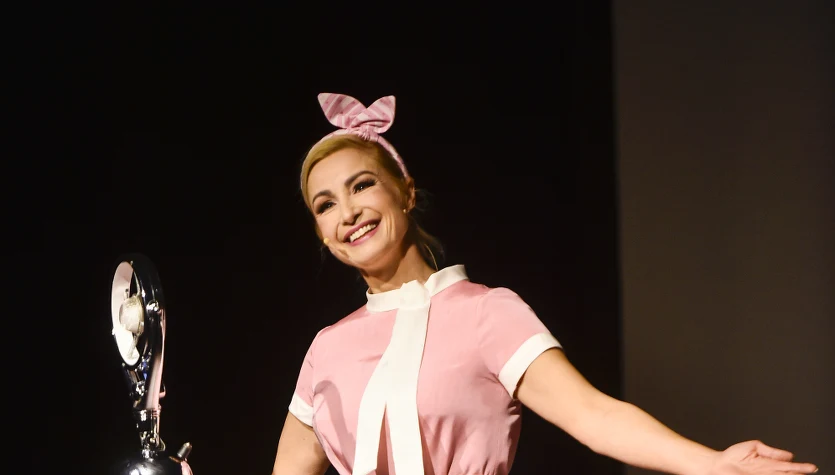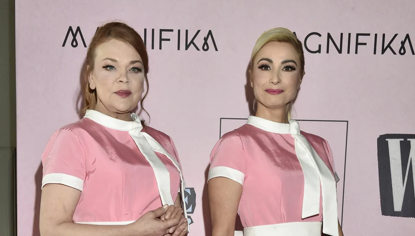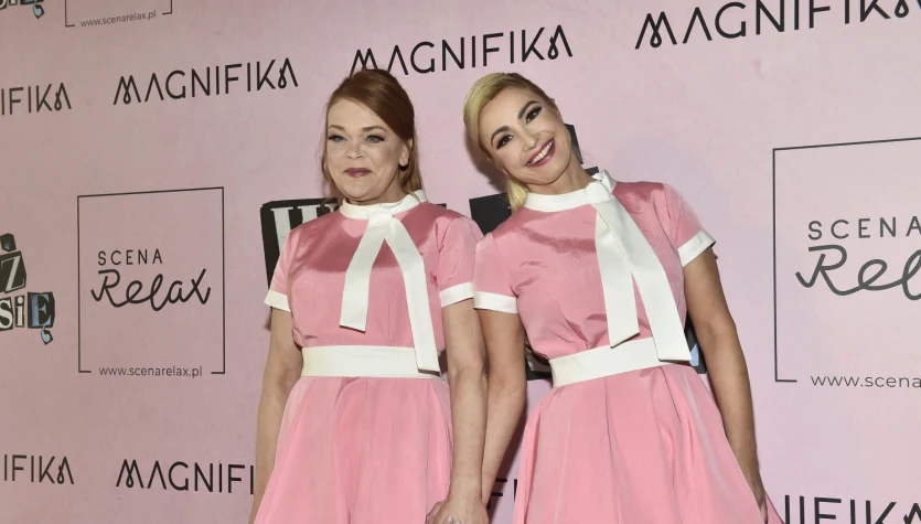 Aktorki pojawiły się na premierze w dziewczęcych sukienkach, całe na różowo. Na scenie miały na sobie także różowe opaski. Stylizacje uzupełniły pudrowe czółenka na niskim obcasie.