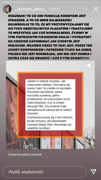 "To co mnie najbardziej bulwersuje to to, że my przyzwyczailiśmy się do tych obrzydliwych plakatów i traktujemy to wszystko, jak coś normalnego. Żyjemy w tym pieprzonym pisowskim kraju i potrafimy na co dzień zapominać, jak chorym jest miejscem" - podkreślił. "Polska nie jest normalna, ani nie jest dobra i czas chyba się obudzić i coś z tym zrobić!!!" - zakończył.