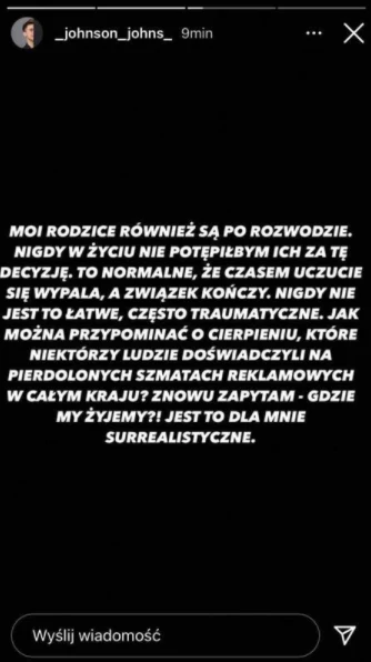 Kietliński postanowił odnieść się do tego wpisu w kontekście własnego życia prywatnego. "Moi rodzice także są po rozwodzie" - przypomniał i podkreślił, że nigdy nie potępiłby ich za tę decyzję. Jego zdaniem "to normalne", że uczucie "czasem się wypala" a "związek kończy".
