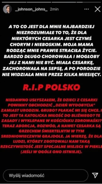 Chłopak odniósł się także do kwestii porodu cesarskiego. "Niedawno usłyszałem, że dzieci z cesarki powinny obchodzić 'dzień wydobycia' zamiast dnia urodzin. Grubo. Płakać mi się chce" - skomentował.