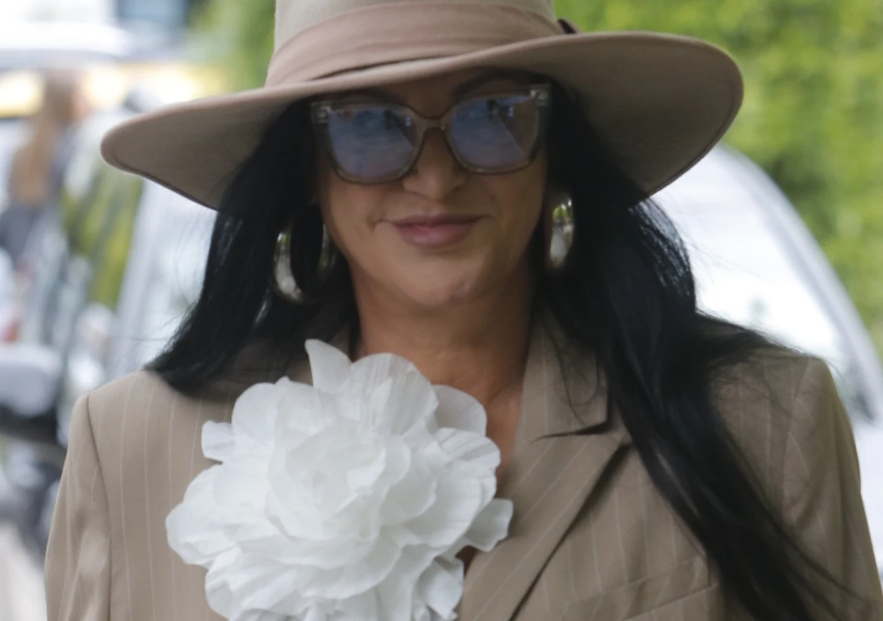 Kayah na konferencję Polsat Hit Festiwal wyglądała... tajemniczo. Uwagę zwraca beżowy garnitur oversize, kapelusz, okulary oraz wielki biały kwiat jako ozdoba marynarki.